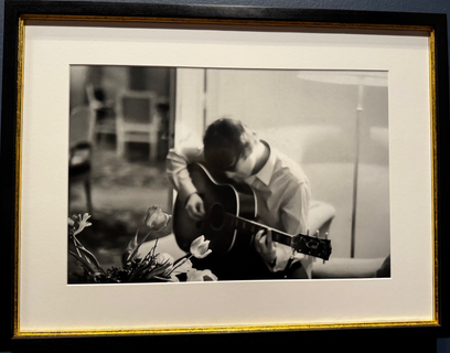 It begins in the earliest days when the fab four begin their rise to superstardom and Beatlemania. Going from the UK to Paris, and then it moves into the four young lads from Liverpool touching down in the USA for the first time. It shows through candid photos by Paul how these musicians in their early twenties react and deal with the press, and the public with screaming girls at every turn. The exibit moves through photos taken along this journey. Onto their first time in New York and Miami and the hysteria that ensued about the mop tops from the UK. The exhibit is accompanied by reels from the early days including their first American press interviews, the Ed Sullivan Show and their antics amongst themselves as their popularity exploded in America in February, 1964. In my opinion, as a music photographer...the body of the photography I saw in this collection is perfectly imperfect. Some were blurry and oddly framed, but all these images expertly captured the essence of the moments both private and public. This personal collection clearly tells the story of the experiences that these young musicians were having in the beginning of the explosion of what was to become Bealtlemania. It was surely history in the making. In music photography I truly believe it is the capturing of the 'essence' in the moments in time in the camera that are what makes the images really special. And Paul accomplishes this perfectly in this group of images called, "Eyes of the Storm". Like this intimate moment of John playing his guitar to himself in a hotel room.